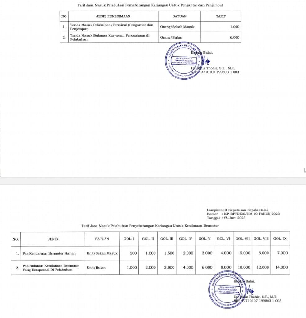 Tarif sesuai SK Gubernur ini, hanya berupa tarif angkutan, sehingga regulator pelabuhan Balai Pengelola Transportasi Darat (BPTD) Kelas II Kaltim harus mengeluarkan tarif terpadu yang didasarkan UU Nomor 17 Tahun 2008 tentang Pelayaran serta Peraturan Pemerintah (PP) Nomor 15 Tahun 2016 tentang jenis dan tarif atas jasa Penerimaan Negara Bukan Pajak (PNBP).