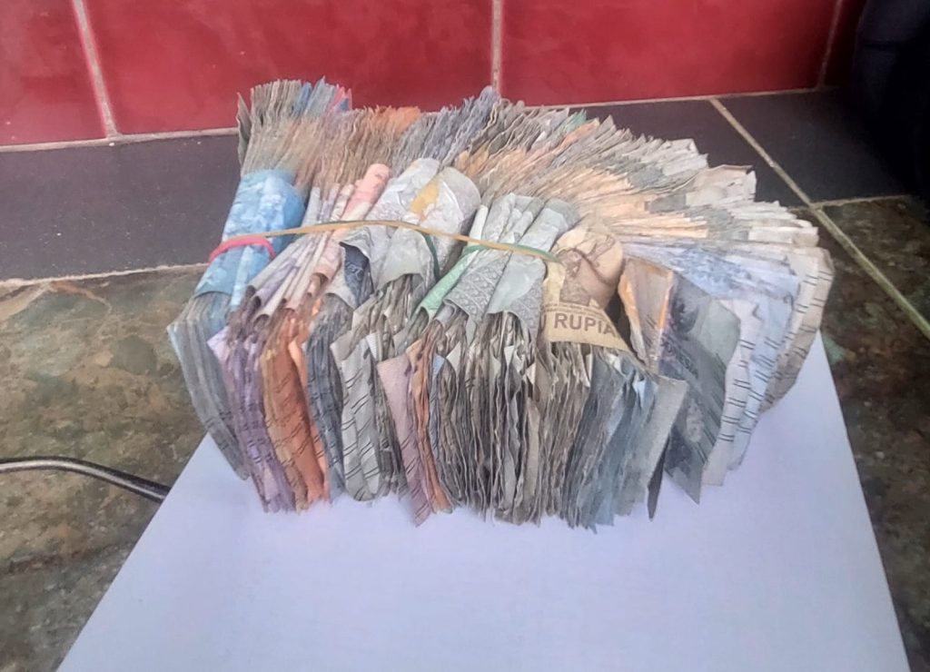 Sedang yang berbentuk kupu-kupu itu unik. Sebagian tim yang menghitung menyebut, itu uang  gaya pedagang zaman dulu. Justru, ada yang bercanda agak magic. “Mungkin untuk penglaris. Jadi uangnya dibentuk-bentuk. Atau kreasi ultah,” kelakar bapak-bapak yang membuat suasana penghitungan jadi segar