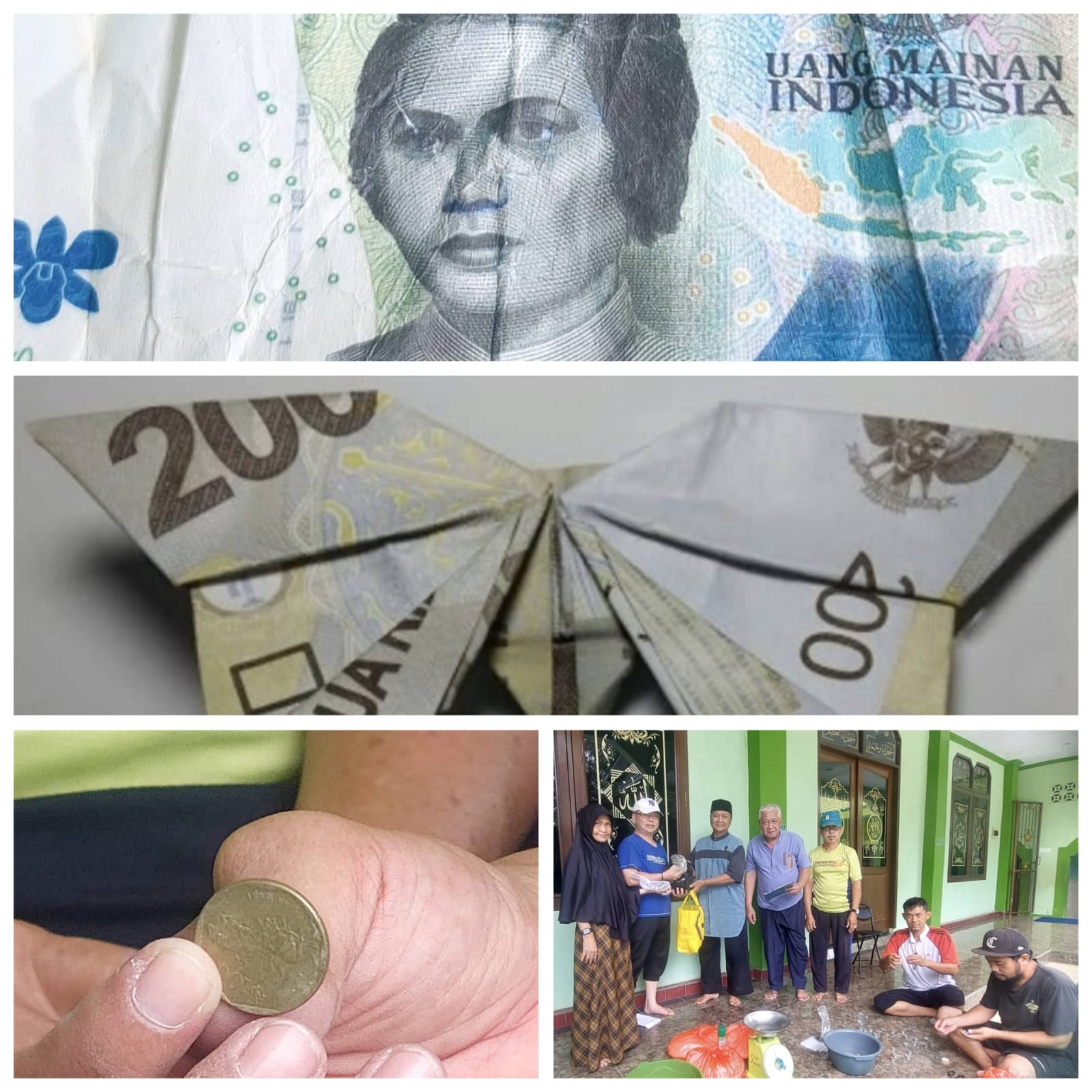 MAINAN: Walau uang mainan tetapi niat warga bersedekah. Tampak uang mainan itu dan desain kupu-kupu serta uang koin lama dan Nur Ali bersama tim menerima hasil sedekah Berseri dan Jimat