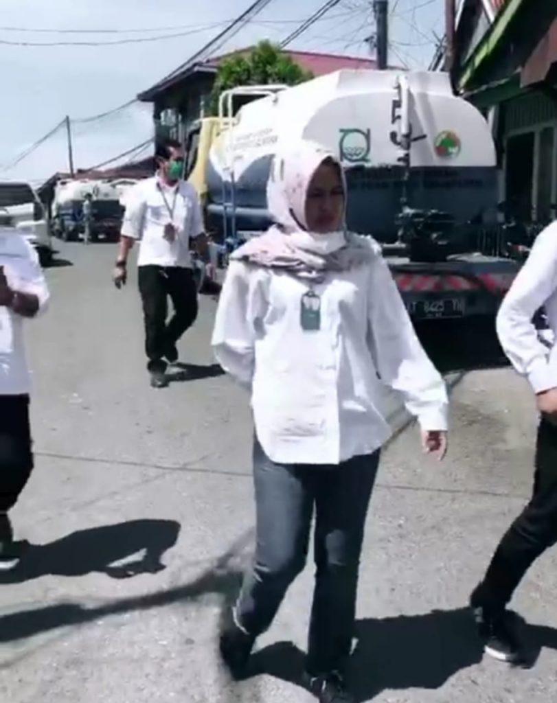 DROPING: Dirum PDAM Noer Hidayah saat memimpin droping air bersih ke pelanggan di kawasan Kampung Baru