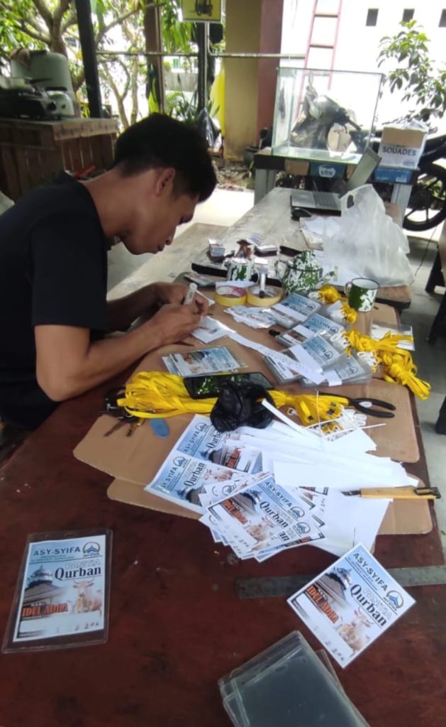 “Kita jauh-jauh hari survei. Melihat kualitas kurban dan sertifikat hewan kurban serta bobot. Ada harga Rp21 juta sampai Rp22 juta. Prinsipnya, sapi sudah siap tinggal diantar ke BTN saja,” ujar Agus Jauhari yang mempersiapkan meja potong kurban untuk pemotongan agar teratur, rapi dan mekanismenya berjalan tertib bersama Rudy