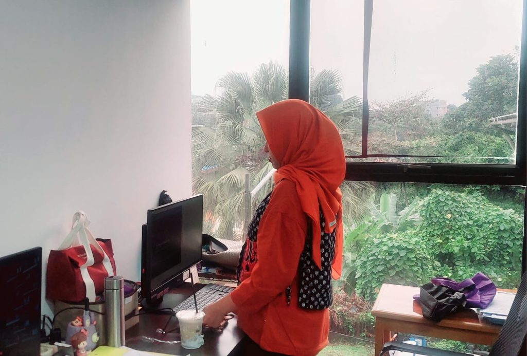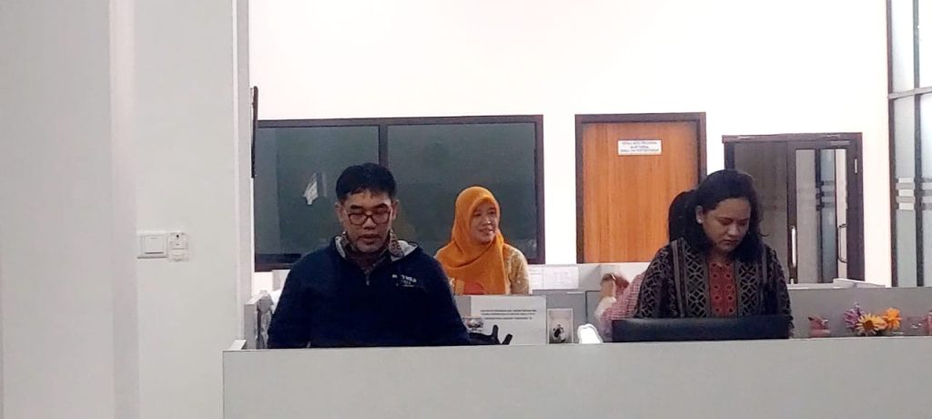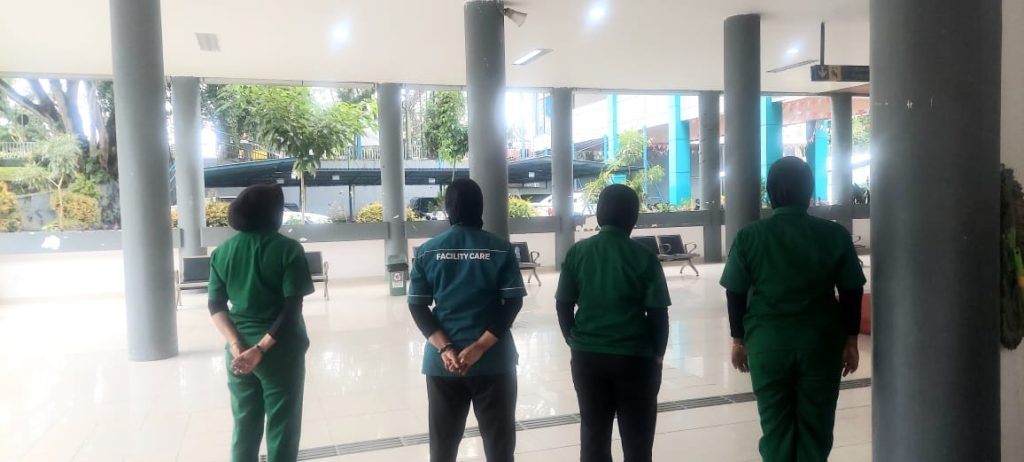 Mereka pegawai dari seksi sarana, prasarana, lalu-lintas terlihat yang lagi bekerja otomatis berdiri sempurna. “Kita ikutin regulasi saja. Jadi harus berdiri, sebab sudah jadi ketentuan setiap hari,” kata Andri Eka  yang bertugas di seksi lalu-lintas sontak berdiri