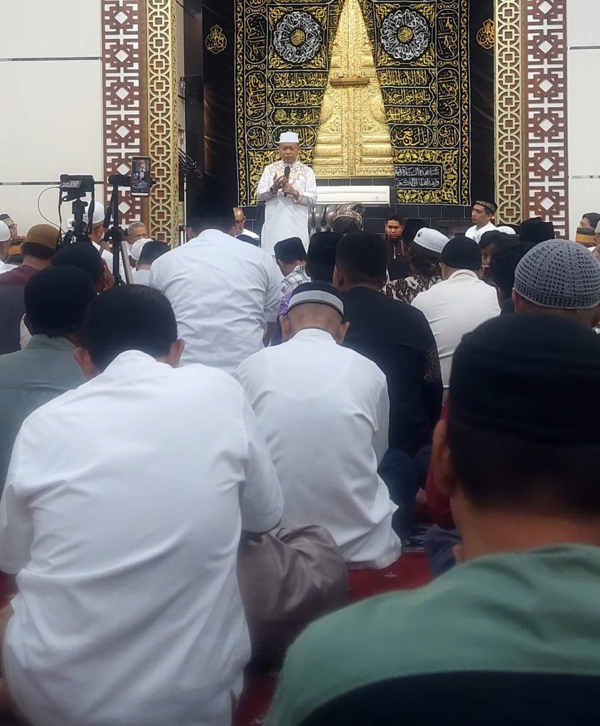 TAUHID: DKM Masjid Namirah berpose dengan Ustaz Das'ad Latif dan anggota DPRD Kaltim Yusuf Mustafa dengan simbol keesaan Allah (tauhid)