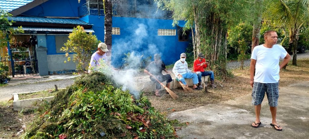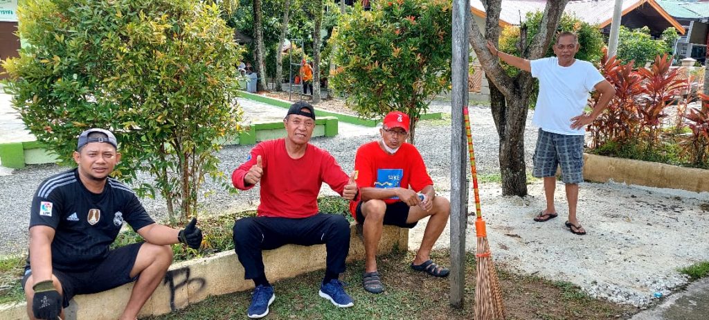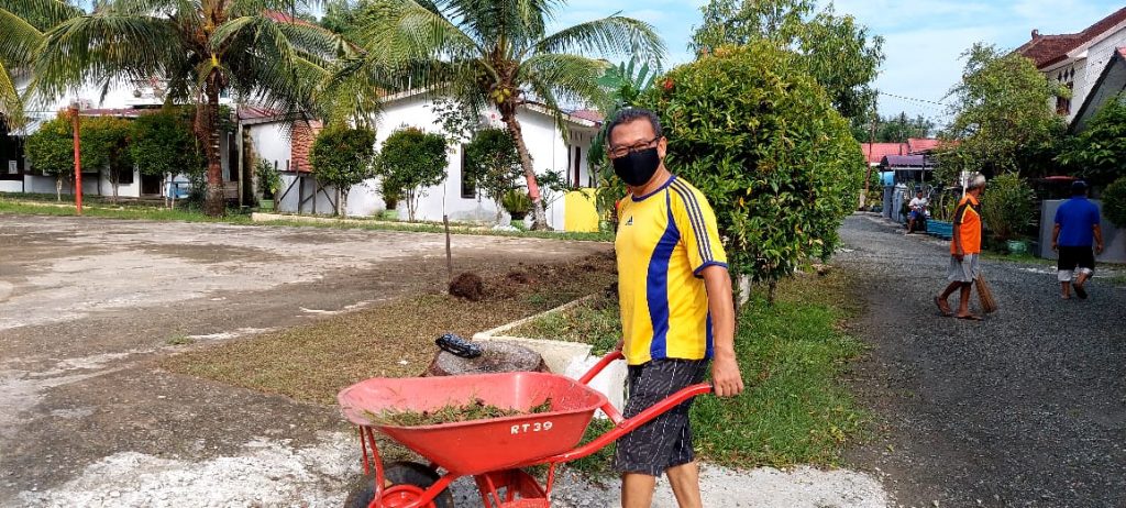 Porsi kerja bakti warga RT 39 sudah terbentuk. Membersihkan lingkungan sekitar lapangan. Lainnya seolah sudah membagi kelompok. Menyapu dahan, memotong bahkan suami Bu RT, Zulkifli sangat antusias tak hanya lingkungan lapangan, ia begitu rajin berkeliling menggunakan mesin pemotong rumput senar di halaman rumah warga. “Terbaik Pak Zulkifli itu. Luar biasa,” puji Rudi, yang terlihat memotongin dahan-dahan sekaligus meratakannya.