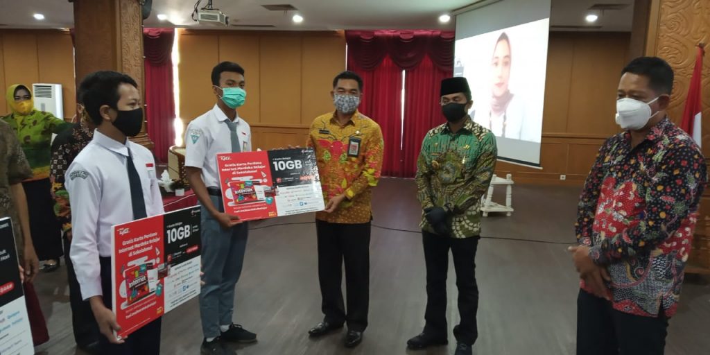 TINTAKALTIM-PENAJAM-Bupati Penajam Paser Utara (PPU) Abdul Gafur Mas’ud (AGM) didampingi Kepala Dinas Pendidikan Pemuda dan Olahraga (Disdikpora) Alimudin, dan Kepala Dinas Komunikasi dan Informatika (Diskominfo) Budi Santoso, menyerahkan secara simbolis kartu perdana internet Merdeka Belajar Jarak Jauh (MBJJ) kepada 4 perwakilan siswa serta 1 orang guru di Aula Lantai 1 Kantor Bupati, Kamis (10/9).