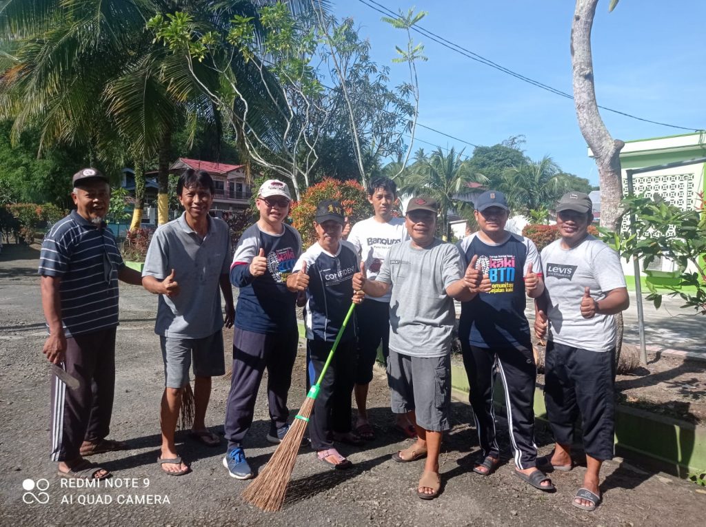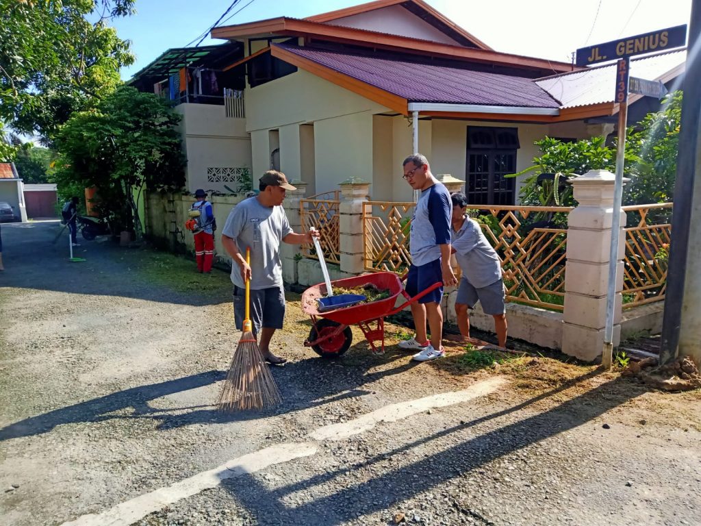 Media ini ikut berbaur. Ternyata, ada warga yang datang pukul 07.30 Wita. Bekalnya sapu lidi dan sarana lainnya disiapkan Bu RT. Tangan-tangan ikhlas itu menyapu di lapangan. Warga lainnya bekerja di depan rumahnya sendiri sebagai wujud kerja bhakti.