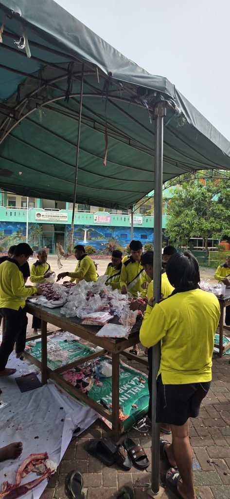 Penyembelihan hewan kurban itu dilakukan bersama-sama. Tentu membuat kekompakan dan kebersamaan warga sekitar khususnya jamaah masjid. Mereka menggunakan seragam warna kuning. Sikap kekeluargaan (ukhuwah) diperlihatkan oleh panitia