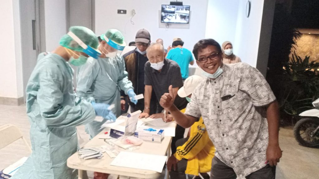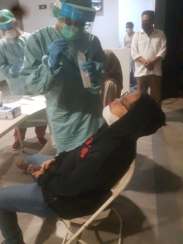 Swab test itu beda dengan rapid test yang hanya diambil sampel darah untuk mendeteksi keberadaan virus corona. Terlihat Roy Nirwan memantau dari lantai atas. “Sudah semua swab. Yang sudah selesai, ayo bergabung ke atas,” ajak Roy.